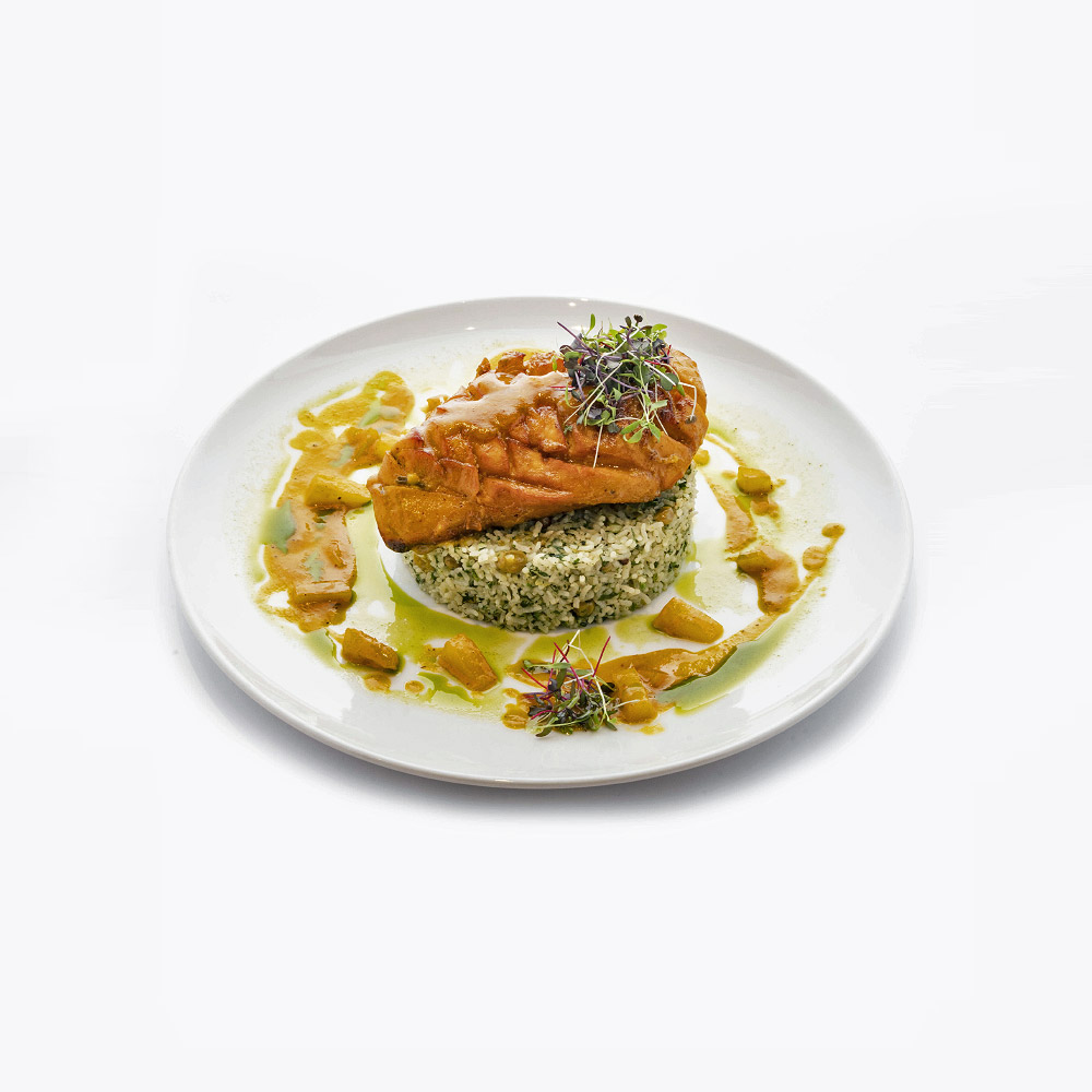 سینه مرغ مزه دار شده در پوره انبه و خامه، برنج سرخ شده با سبزیجات و صیفی جات، گارنیش